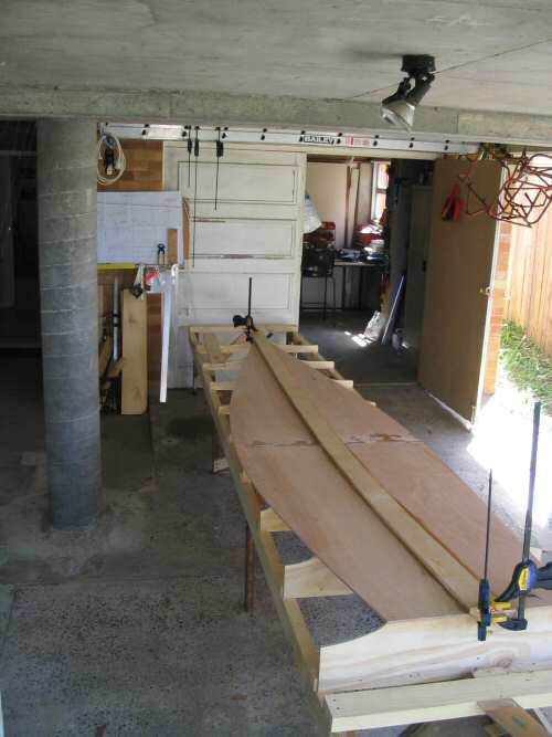 I found using the partially complete jig a useful place to manage the large scarfed panel - this before I had fitted each of the risers to the cross-members. Having completed the scarfing and cutting out of the bottom panel I added the risers and finished off the jig, then got on with attaching the bottom and the keelson. 1. The risers were bevelled where the bottom panel would be sitting at an angle and then sanded to remove any 'hard' corners. 2. At last I have something that looks boat shaped as the bottom panel is secured to the jig and the keelson epoxied. |